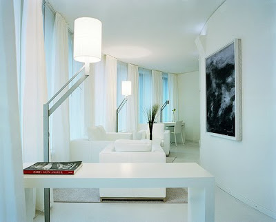 The futuristic Living-room of the Suite blanche at the Hotel Concorde Berlin adds style and modernity. A white marble wall radiates a pleasant coolness in the bedroom amplifies the multitude of white curtains.